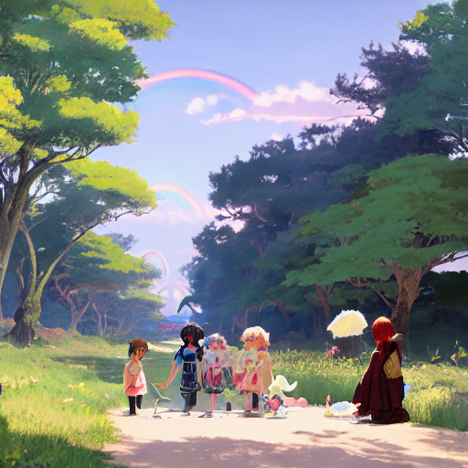 وبينما كان الأطفال يرقصون تحت أقواس قزح ، بدأت الألوان تدور حولهم. أصبح سحر قوس قزح أقوى مع كل خطوة ، ورفعها إلى أعلى وأعلى من الأرض. وجدوا أنفسهم محلقين في السماء جنبًا إلى جنب مع أحادي القرن والجنيات ، يضحكون ويغنون بفرح وهم يطيرون.